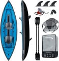 The kayak has excellent construction: an elastic strap area for placing items, a safe triple air valve design, an efficient integrated drain plug, sturdy handles, a fabric cover with zipper to protect the hull and a removable inflatable high-back seat.